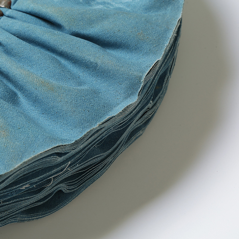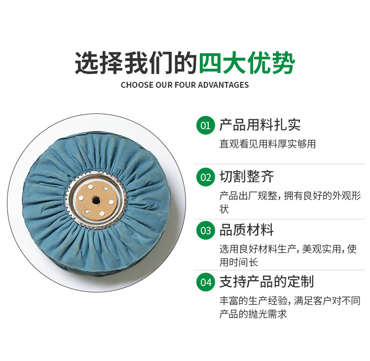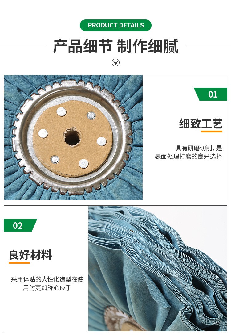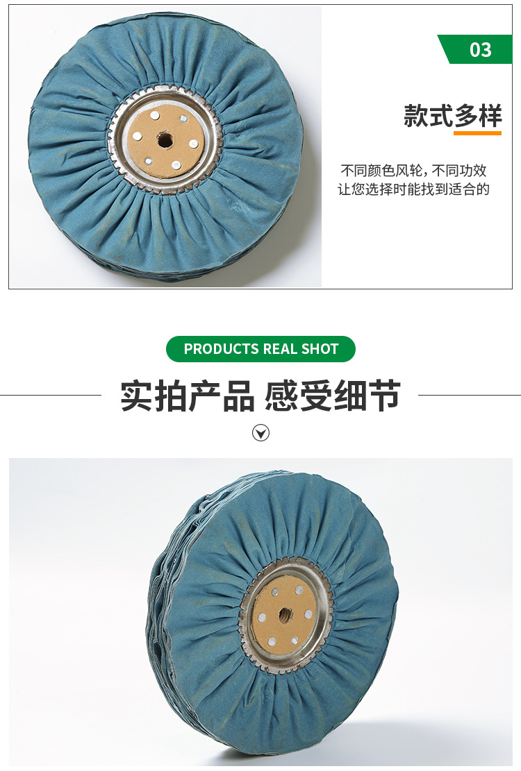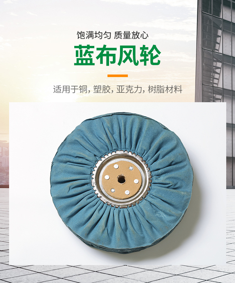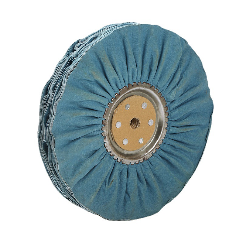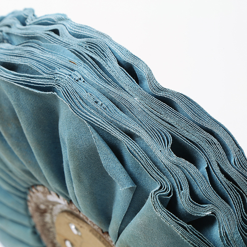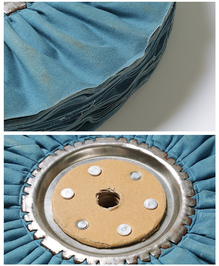 3)風(fēng)冷布輪。采用45度角線(xiàn)裁法,呈環(huán)形皺褶狀,中間裝有金屬圓盤(pán),具有通風(fēng)散熱的特點(diǎn),宜拋光大型工件。