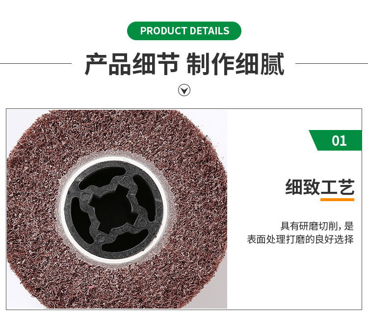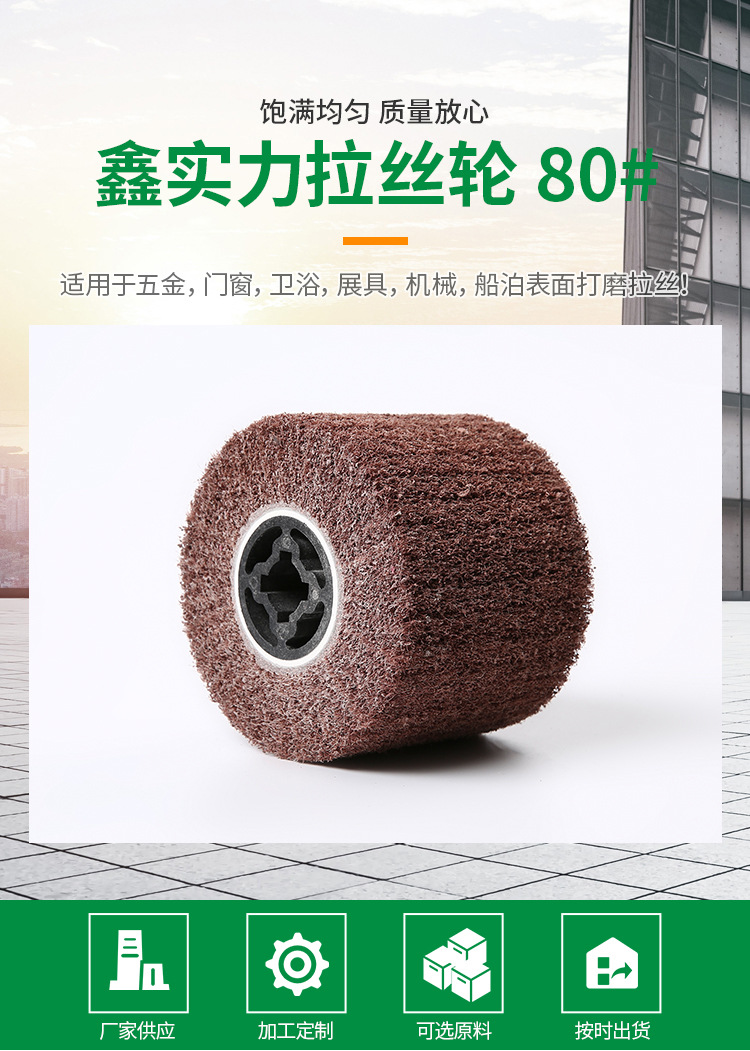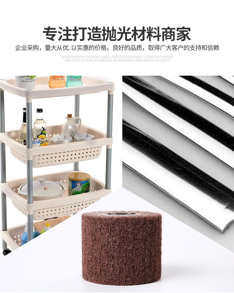 拋光平面拉絲輪-強力手提圓形拉絲輪-尼龍輪-拉絲輪廠家適于要求精密且細致的工作,研磨滑順不產生高壓而留下黑斑,減少瑕疵,不改變工件原重量,對于不銹鋼、鈦合金等材料都能發揮較好的效果。拋磨后的光亮度,很迎合外商對于產品亮度的要求。